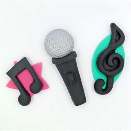 קישוט מיקרופון ותווים מבצק סוכר צבע שחור. מידות: מיקרופון 11/4 ס"מ תו קטן קוטר 5 ס"מ תו גדול 10/4 ס"מ